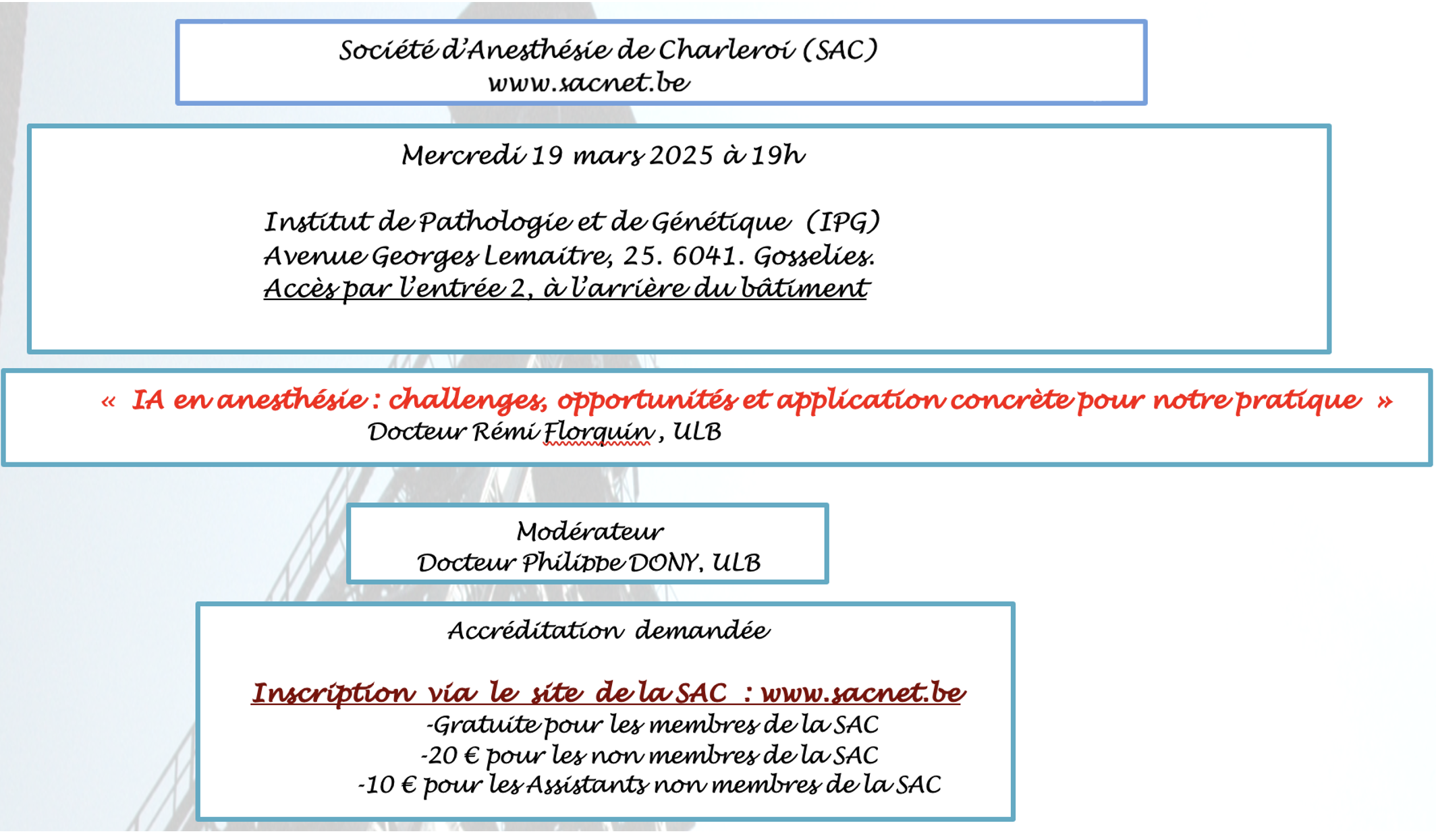 Mercredi 19/03/2025 (19h00) : «IA en anesthésie: challenges, opportunités et application concrète pour notre pratique »